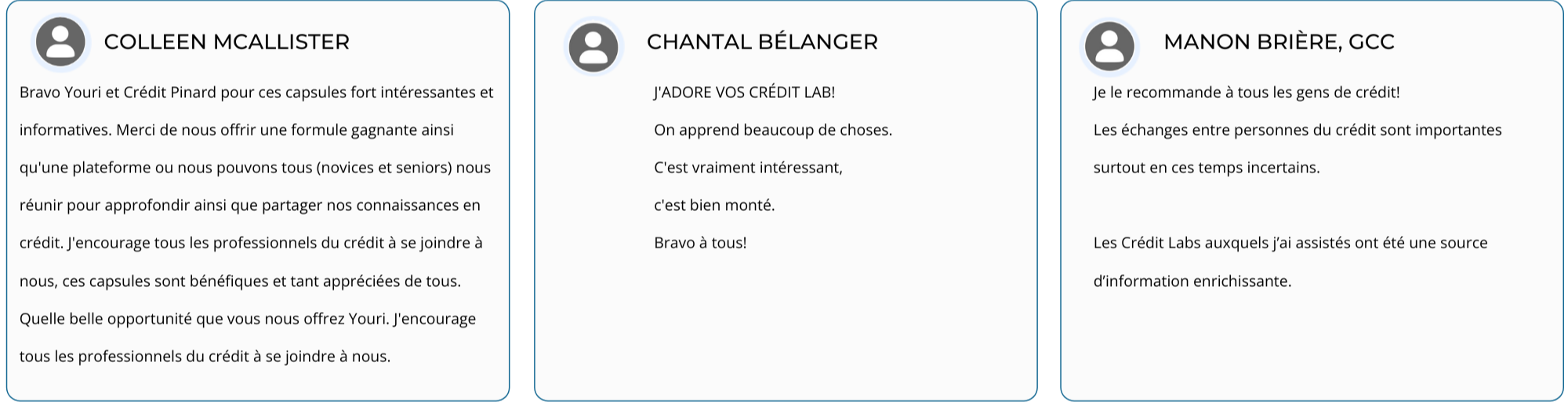 Partage d’expériences en direct avec des collègues en crédit et des experts invités de septembre à juin.